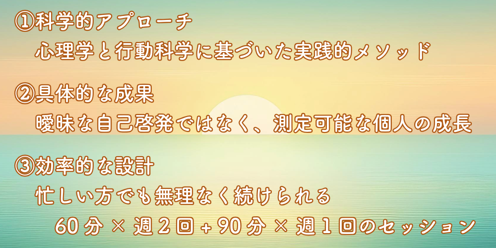 あなたの本来の力を引き出し、具体的な行動で理想の自分に近づくための、集中的かつ実践的な短期集中プログラム。
